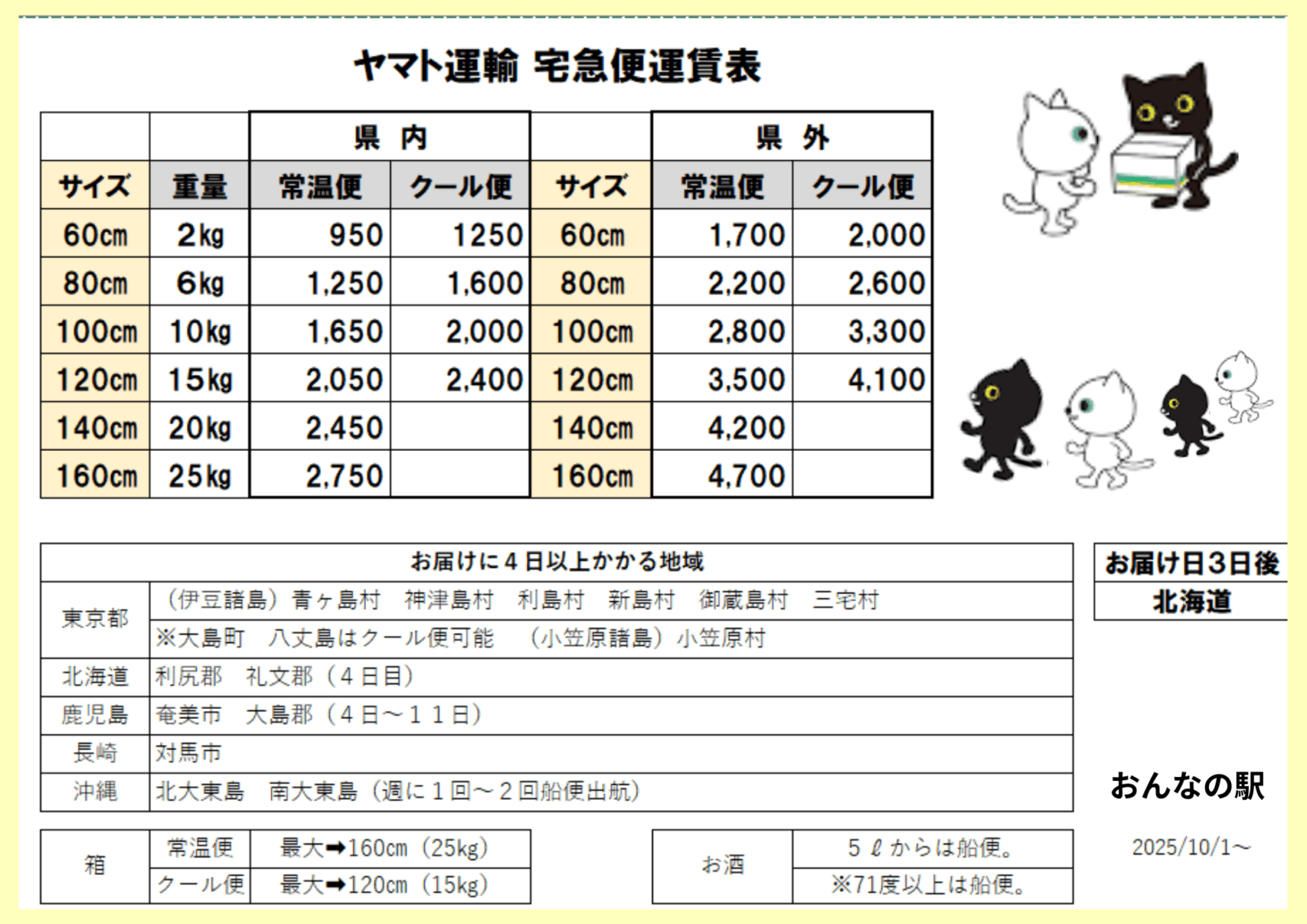 令和7年10月より、お客様より大切なお荷物をお預かりし、梱包及び宅配に関する品質を維持し、安定したサービスを継続するため、誠に恐縮ではございますが運用にかかる費用を料金に反映させていただきたく存じます。